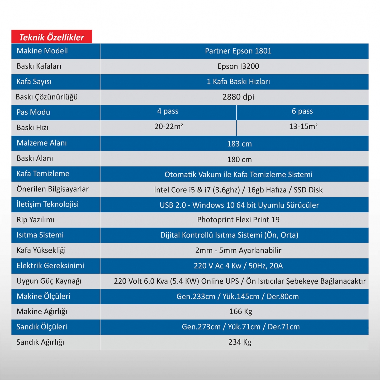 2880 DPI / 3.5PLNet 180 cm print width20 m² per hour in 4 Pass Modes